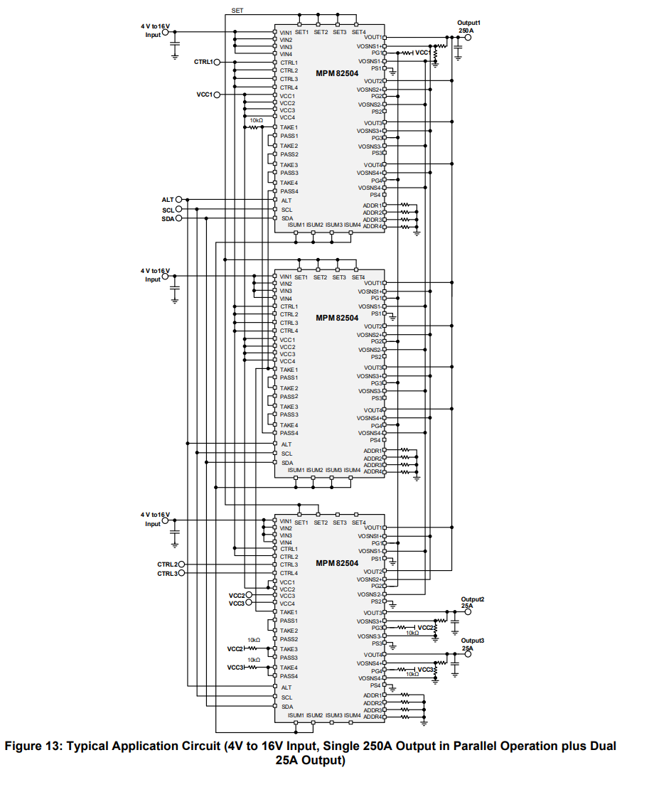 For parallel combination of multiple MPM82504, each device should be configured the same register value for the equal output current and voltages.