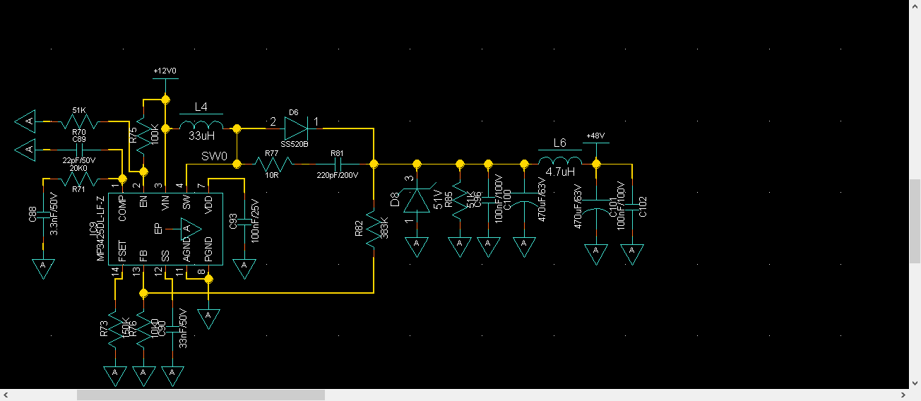 Hello, the 12-48v circuit I designed is as follows. After simulation verification, the output after production is only 37V. Why is that? Will there be any impact if I don’t add an input capacitor? And the voltage waveform of my SW port is shown in the figure. Has magnetic saturation occurred? Should I change the switching frequency? Thank you.