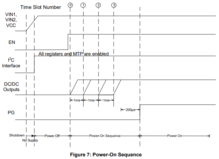 Here is the default power-on sequence as shown in Figure 7 (page 33) of the MPM54304 datasheet, where the total elapsed power-on time is 3.2us by default: