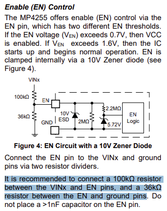 I was reviewing your schematic and notice R74 (Bottom resistor of EN voltage divider) is 6.8kΩ.