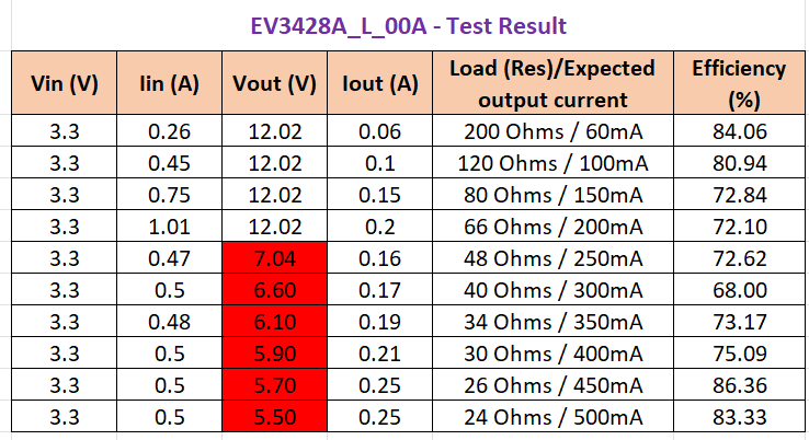 We tested the evaluation board EV3428A-L-00A with various load currents at an input voltage of 3.3V and noticed that when the load current exceeds 250mA, the output voltage dropped below 12V.