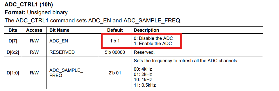 I was using the board by default in mode 3, as I said when I connected at the output of the board a device with power consumption of 1W reading the sensor those always reported 0 values at that moment, the ADC sensor was disabled according to the ADC_CTRL1 (10h) register with value “0” in the bit 7.