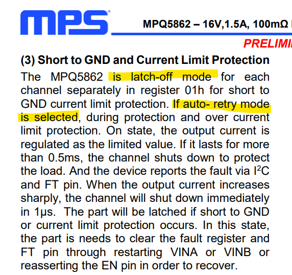 Hi, there is not much information about latch-off mode and auto-retry mode, in the datasheet that I am using : Valeo - MPQ5862-AEC1 - Published Datasheet (MPS Rev#{3} 0.8)
