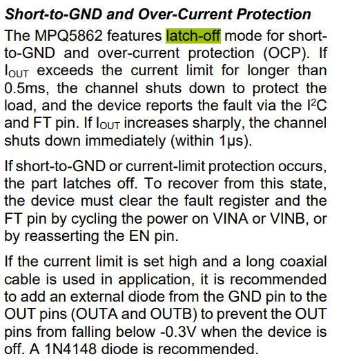The latest revision of the MPQ5862 datasheet (Rev 1.0, dated 3/12/2025) says the following regarding the reactions of the Short-to-GND and Over-Current Protections: