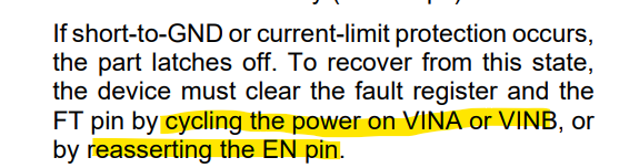 Since that rhetoric is dependent on when the faults are cleared and the timing isn’t specified in the datasheet, the EN being turned off and on again would be limited by how quick those faults can be cleared.