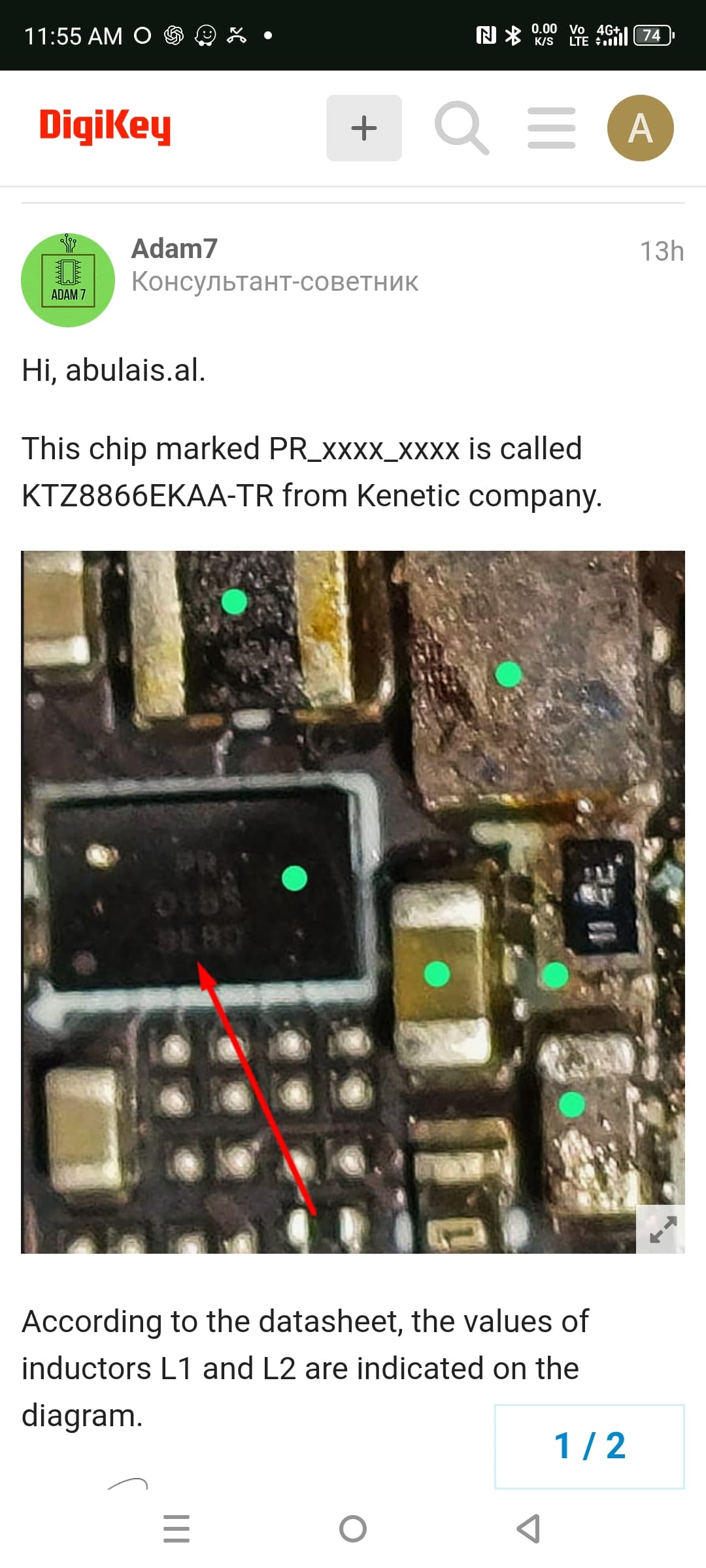 Near the backlight driver IC (KTZ8866), one of the inductors labeled L1/L2 appears burnt or damaged.