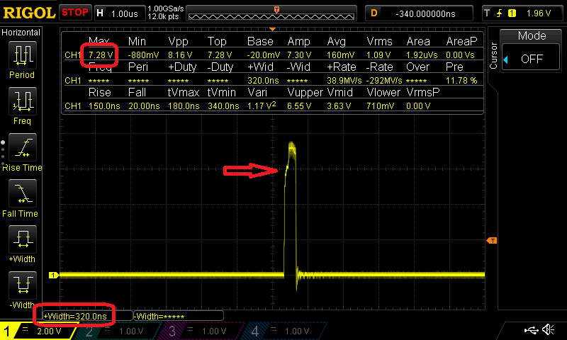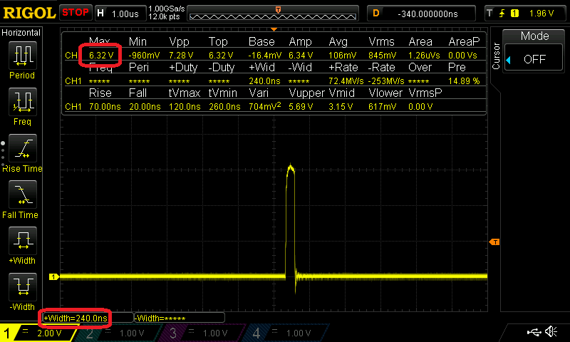 The driver “starts” with a pulse of at least 220ns, but works at 100% with a pulse of at least 320-340ns (the driver makes a clear step on the way up, which is not noticeable on the way down).