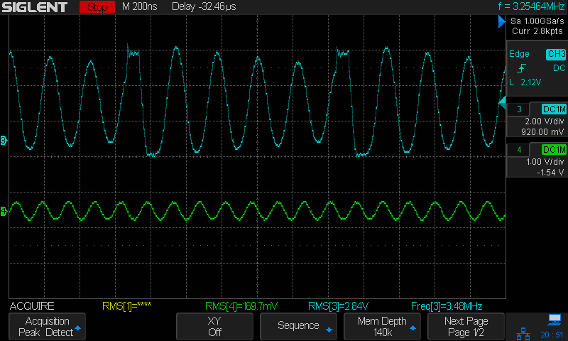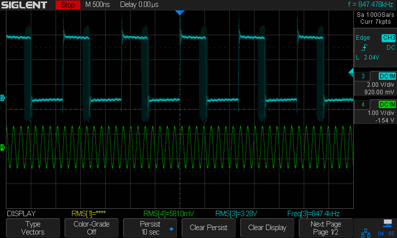 I turned on persistence to see the switching spread and oscillation. green below the classD stage RF field at 6.78Mhz, and the switching at 6.78/8=847.5kHz, MP1496S feeds the classD stage at 2.4V ; load is constant. Isupply is 40mA at 5V; 10 ohms, 220nF extra filter between MP and classD load.