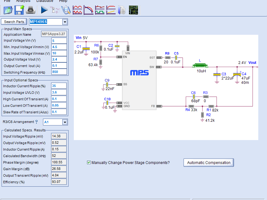 despite the analysis tools saying that the phase margin is around 90 degrees, the device is inherently instable, oscillating at 7khz. input 5V out 2.4V low current around 100mA. external sync at 847.5khz. goal minimal ripple/noise.
