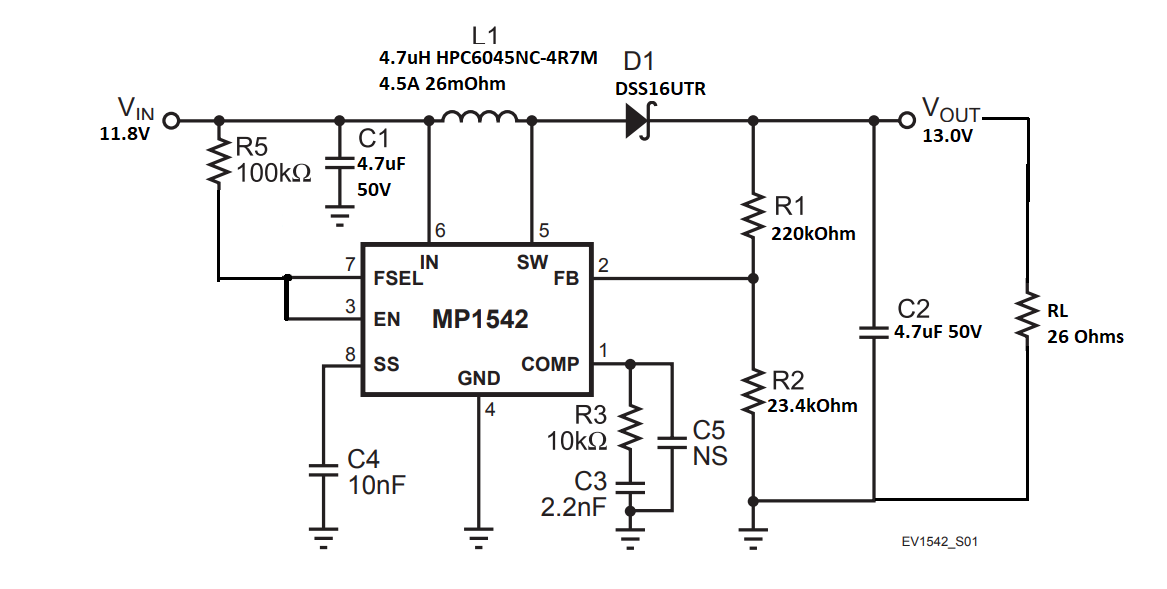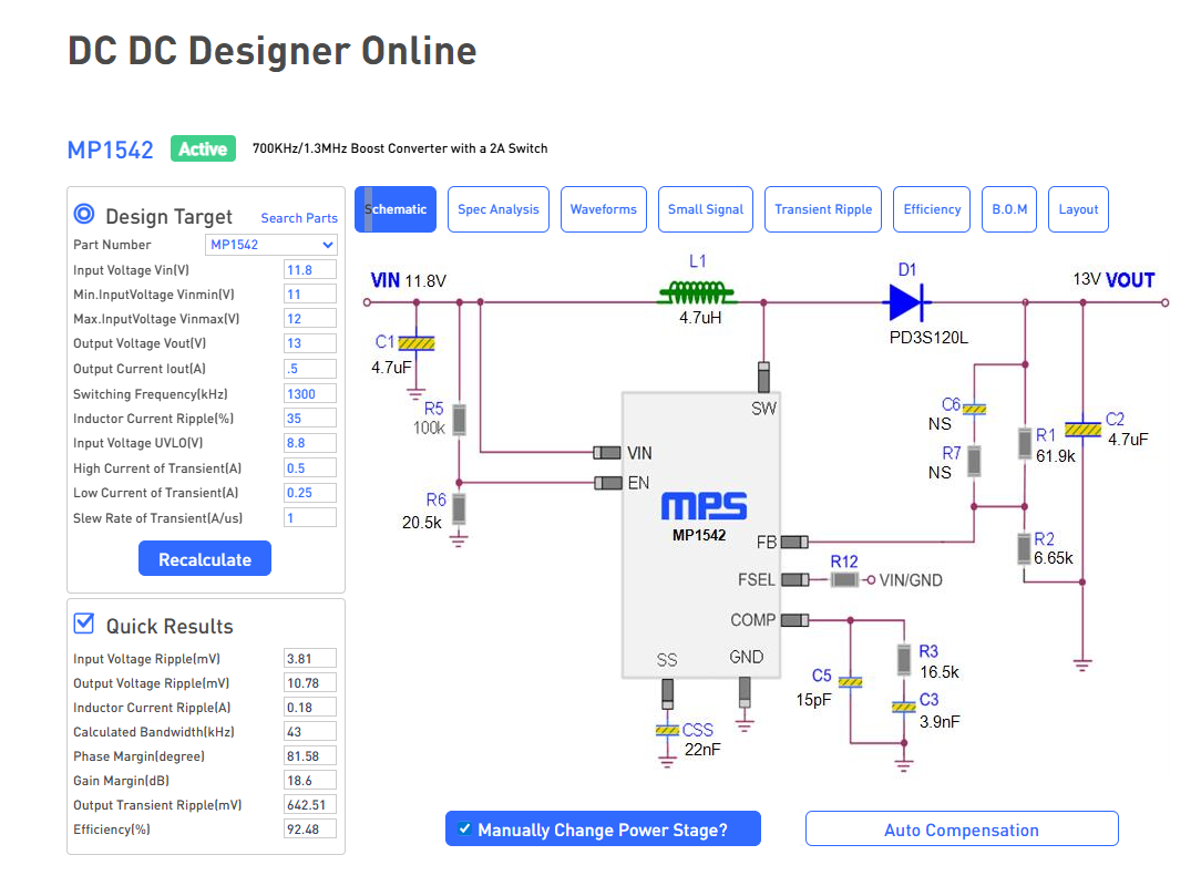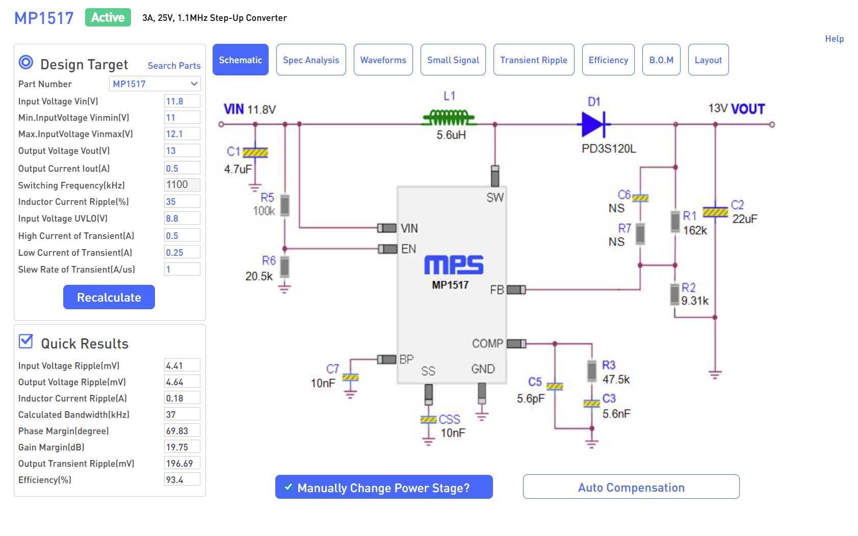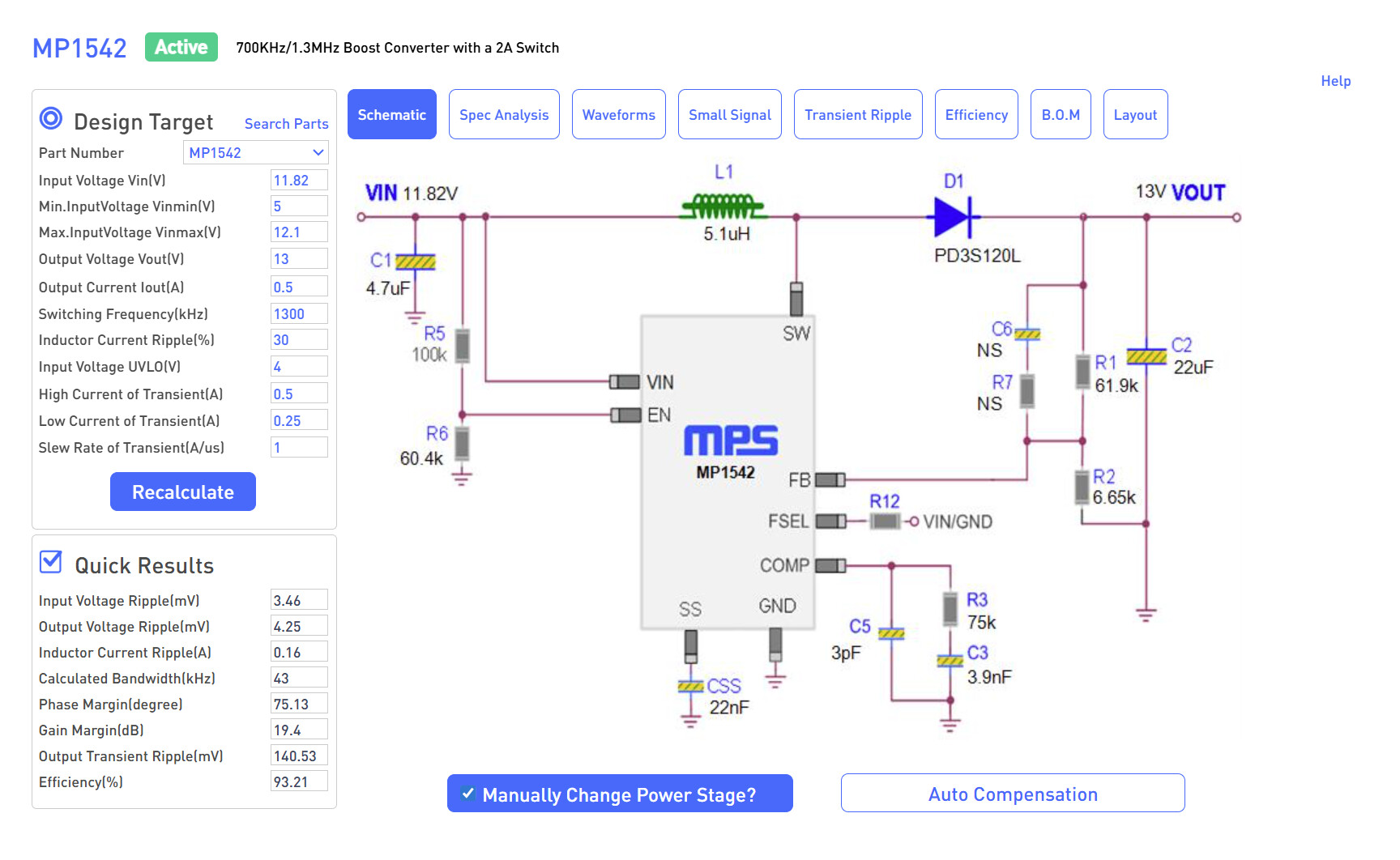 Hi Adhish, I tried the component network values recommended in the first screen capture (5.1uH, 22uF Cout, 75kOhm/3.9nF COMP), and the control loop was now unstable for any load current when input voltage was above 11.3V: and output voltage and COMP both exhibited sinusoidal oscillations. This is much worse than the problem I originally had, where the output was clean for most input voltages and load currents, and only exhibited operating frequency jump issues at particular light load operating points.