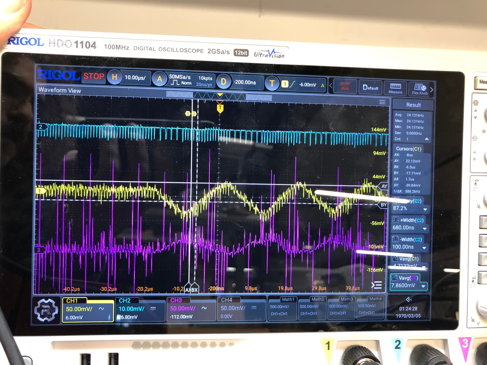 We have output voltage (yellow, AC coupled), switched node (blue, stray voltage pickup from a nearby probe) and COMP pin voltage (purple, AC coupled, sorry for the poor COMP probe grounding). The COMP pin DC voltage is 0.794V.