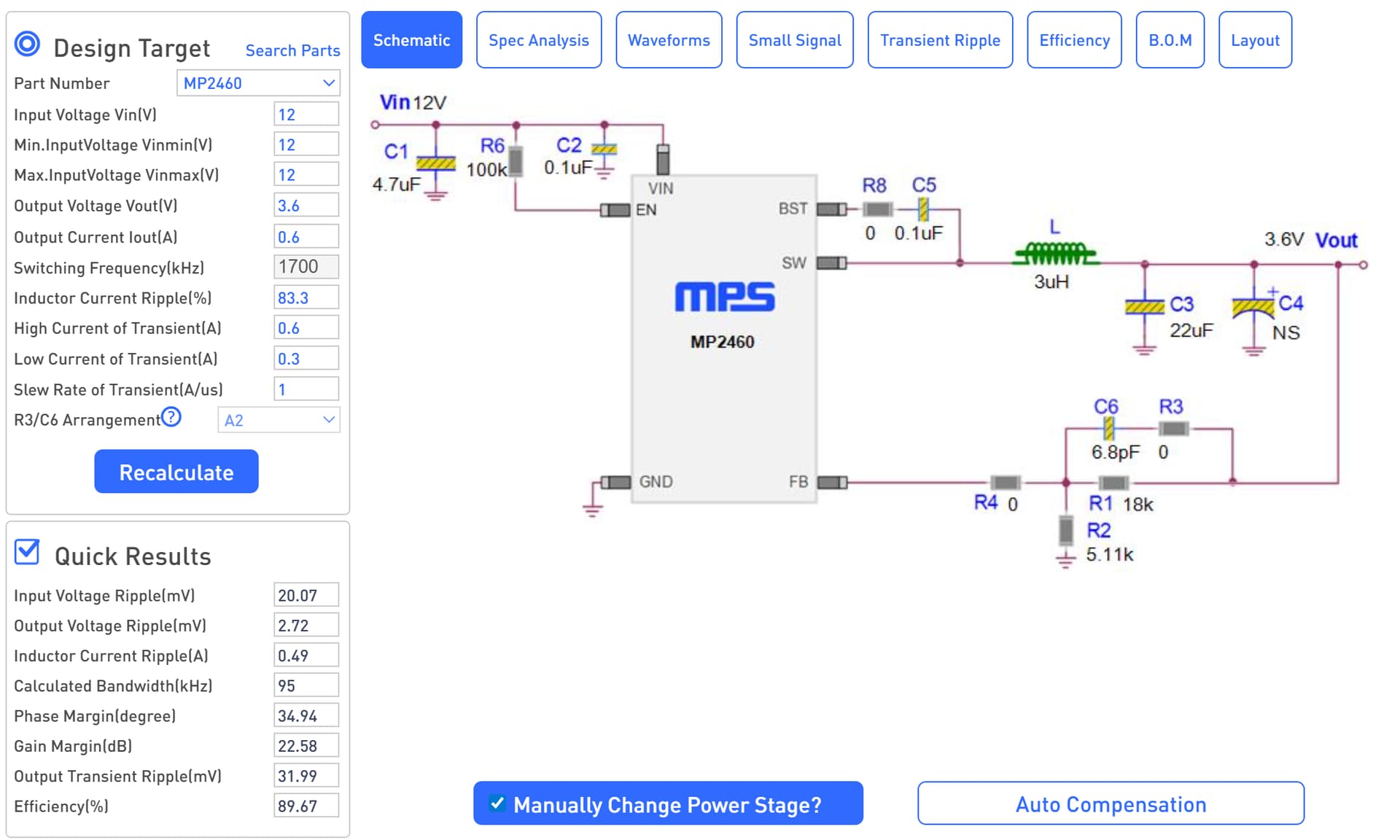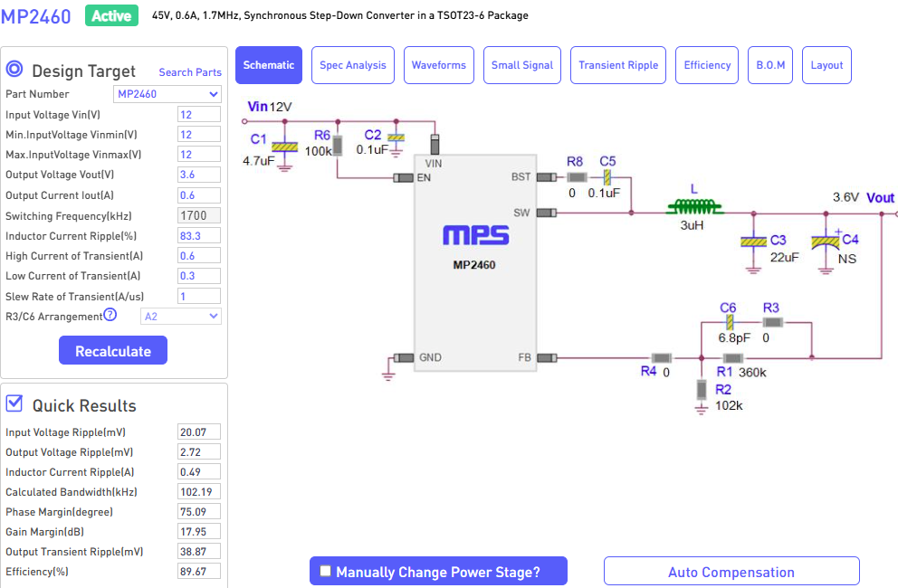 We can use our DC-DC designer tool see what would happen if you decide to use your specified values for feedback loop. Assuming: Vin =12V, Vout = 3.6V, Iout = 0.6A.