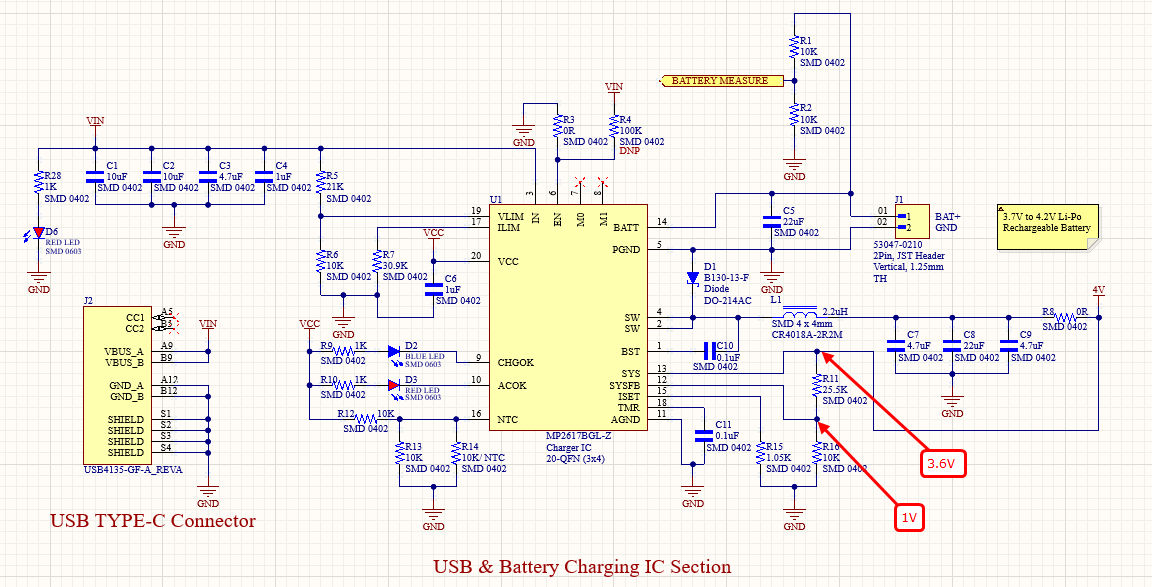 I am experiencing an issue with my schematic when supplying power via USB (5V input). The Vout pin is not reaching the expected 4V, even though I have configured the voltage divider (R11 = 25.5kΩ and R16 = 10kΩ). Currently, the SYS pin voltage is 3.6V, but I need it to be 4V.