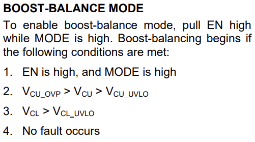 For now, I have tied the ENABLE and MODE pins to a 3.3V power rail to provide known inputs for the MP2643. I am periodically checking the cell voltages with a multimeter. During Boost balancing, VCU is 6.485 and VCL is 3.260V. These voltages are within the limits you mention.