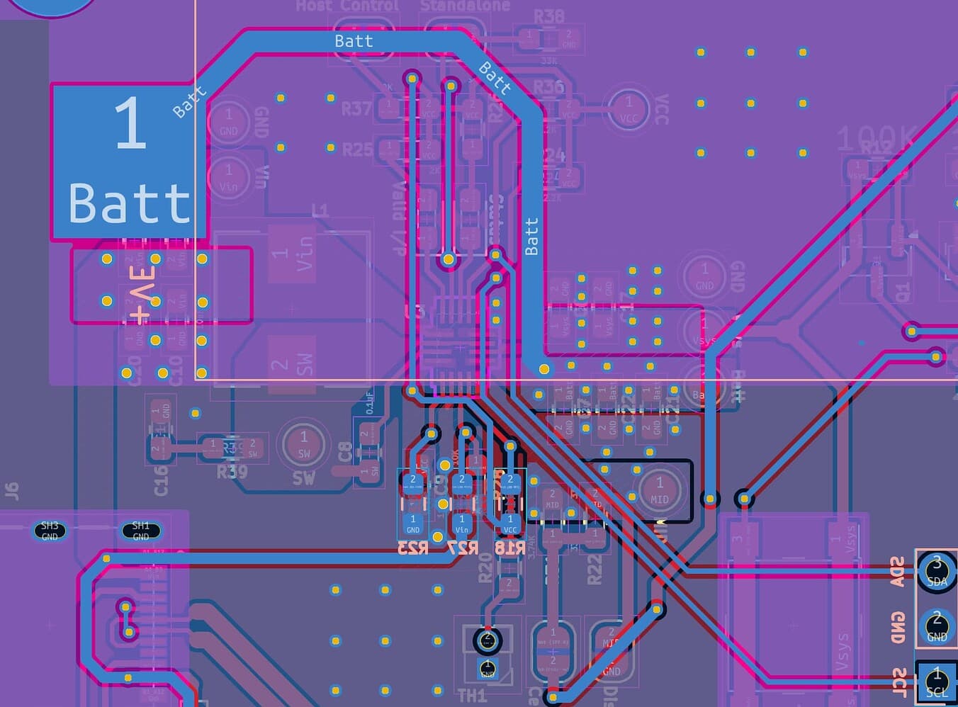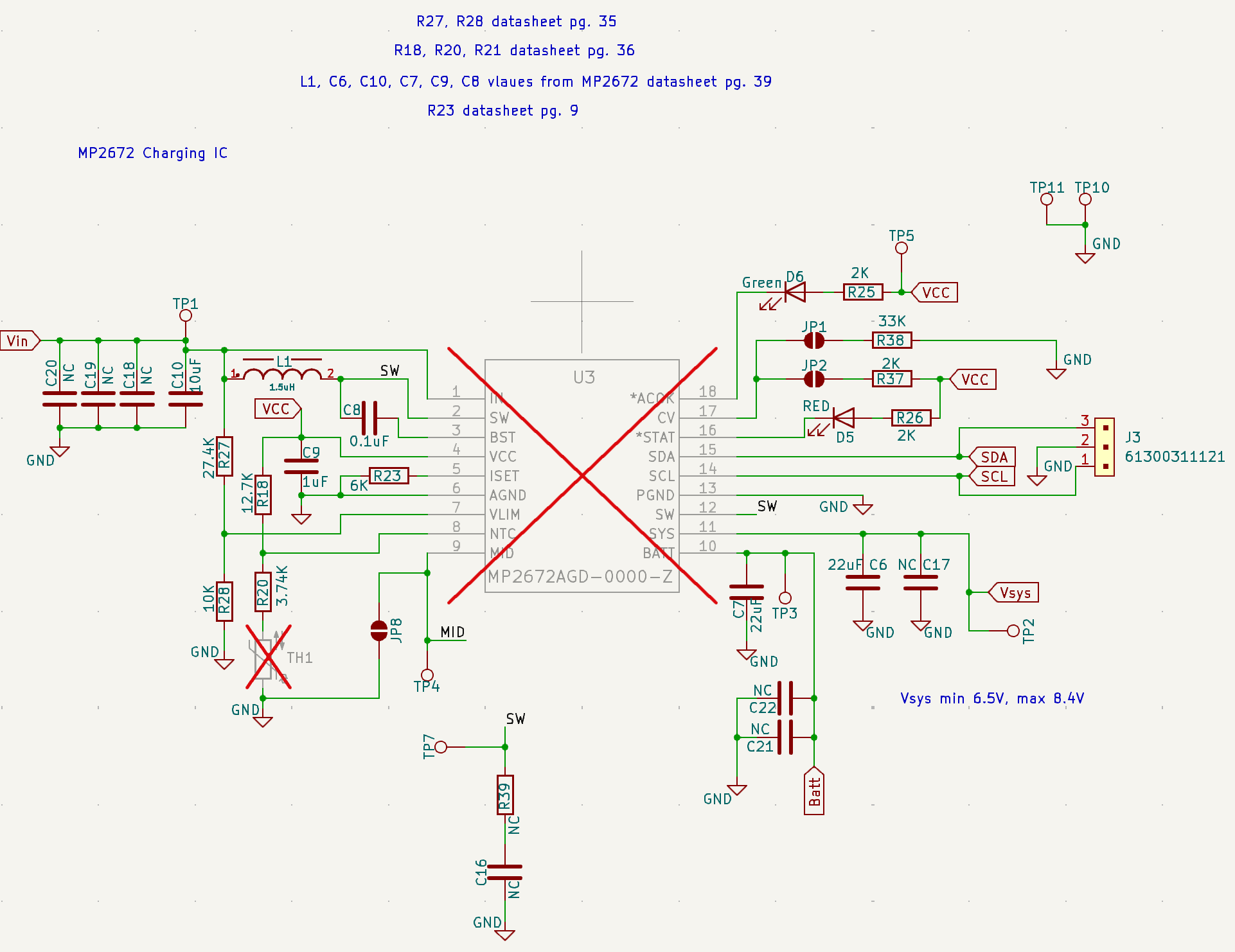 I’m using the MP2672 charging IC in standalone mode with USB Type-C (5V) powering VIN and an ESR protection diode at the input. Initially, everything worked fine, and the batteries charged as expected.