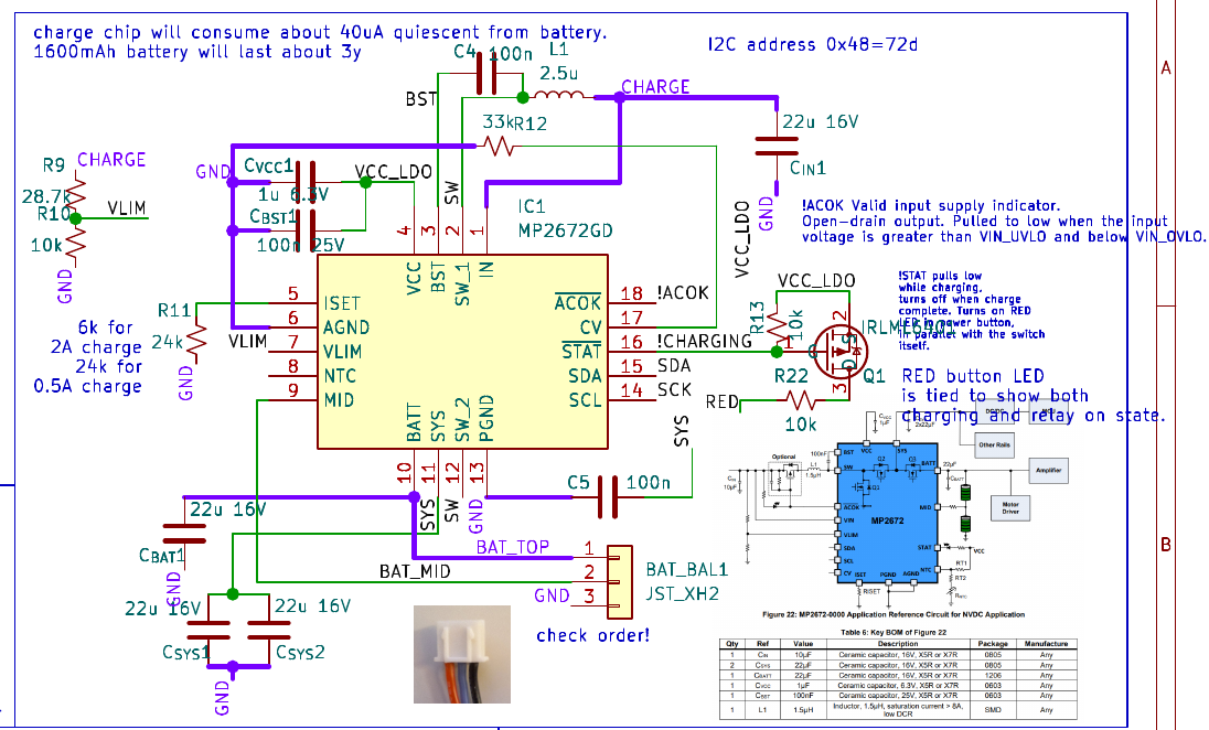 It could be that my PCB traces from MID and BATT are too thin; they are 0.2mm traces on 1oz (35um) copper and google tells me a 10cm trace is about 1/4 Ohm. I will check this. I fixed this on upcoming rev of the board but will check it by soldering blue wire jumpers directly from pin to JTC connector today. Could this be the reason? I.e. could the MPC2672 be thinking it has already mostly charged the battery? It doesn’t explain why the current is so low even when the battery drops down below 7V…