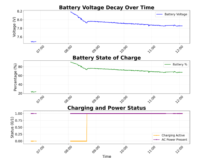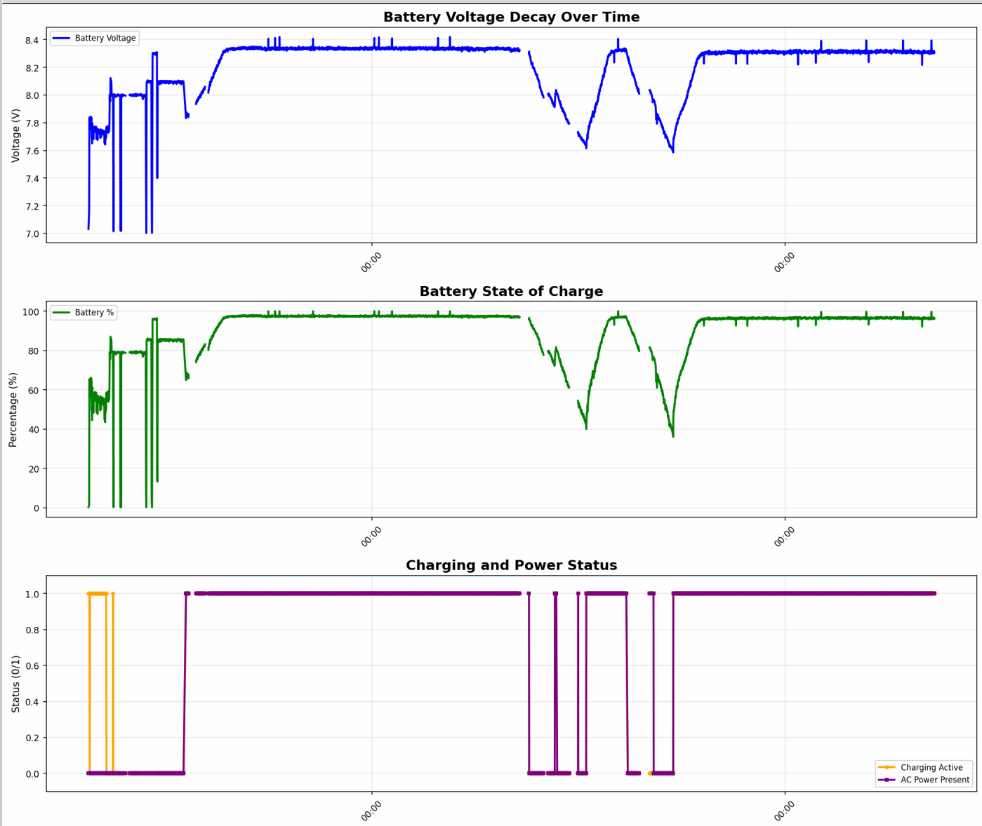 Here is the battery voltage decay plot. We can see charging activated at a voltage of about 7.6V, but it continues to decay.