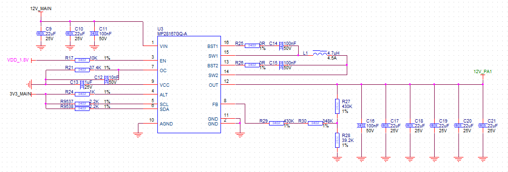 We used 2 MP28167GQ-A chips on our board. The board’s input voltage is 12V, output voltage is 12V, and operating current is 0.5A. The circuit diagram is as follows.