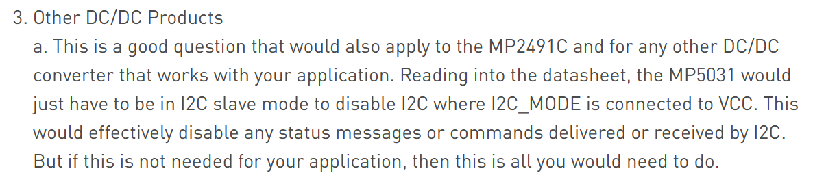 Hi, I came across the below reply from this thread and I need to confirm if this is true because I am seeing unexpected behavior with the MP5031 when I2C_MODE pin is tied to 5V VCC.