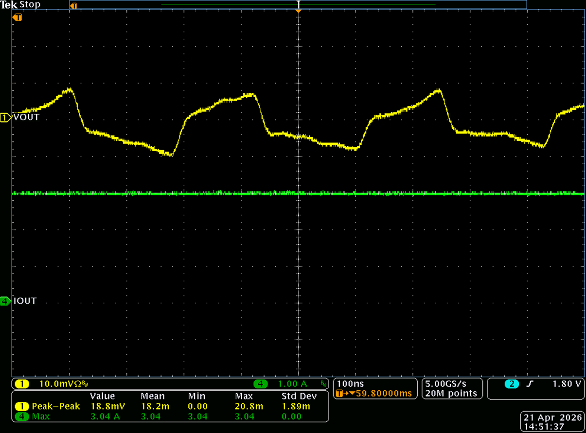 I measure 18.8mVpk-pk ripple using a differential probe across a 2-pin header I installed on the EVM. I scraped away the solder mask on the VOUT plane and GND plane, so I could measure VOUT ripple with a P6247 diff probe from Tektronix. My bandwidth is 20MHz.