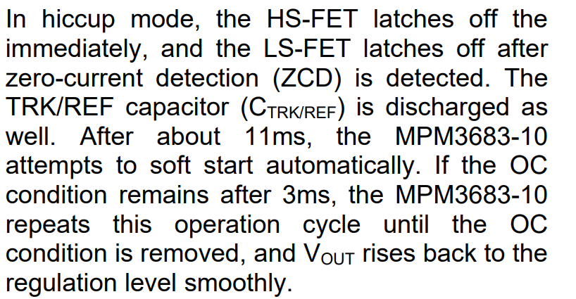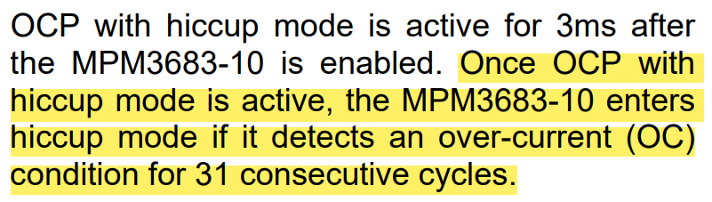 When an OC condition is detected for 31 consecutive cycles, then the MPM3683-10 enters hiccup mode. This is what happens when hiccup mode is enabled: