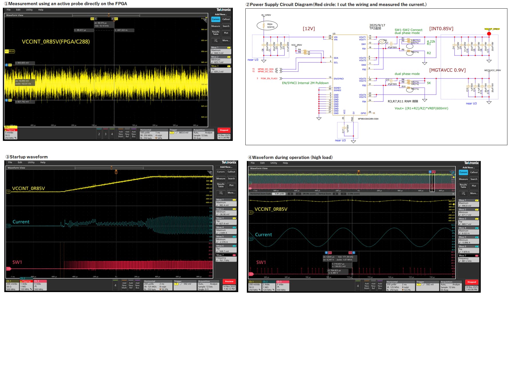 I am using MPM54304GMN-0004 with Vout1 and Vout2 connected in parallel to supply 0.85 V to an AMD XCAU25P FPGA (VCCINT / VCCINT_IO / VCCBRAM). No I²C configuration has been written, so the device is operating in the default Forced-PWM mode (MODE=1).