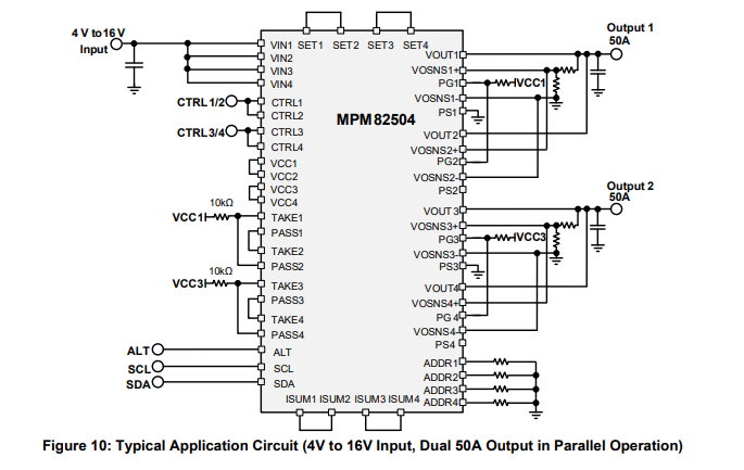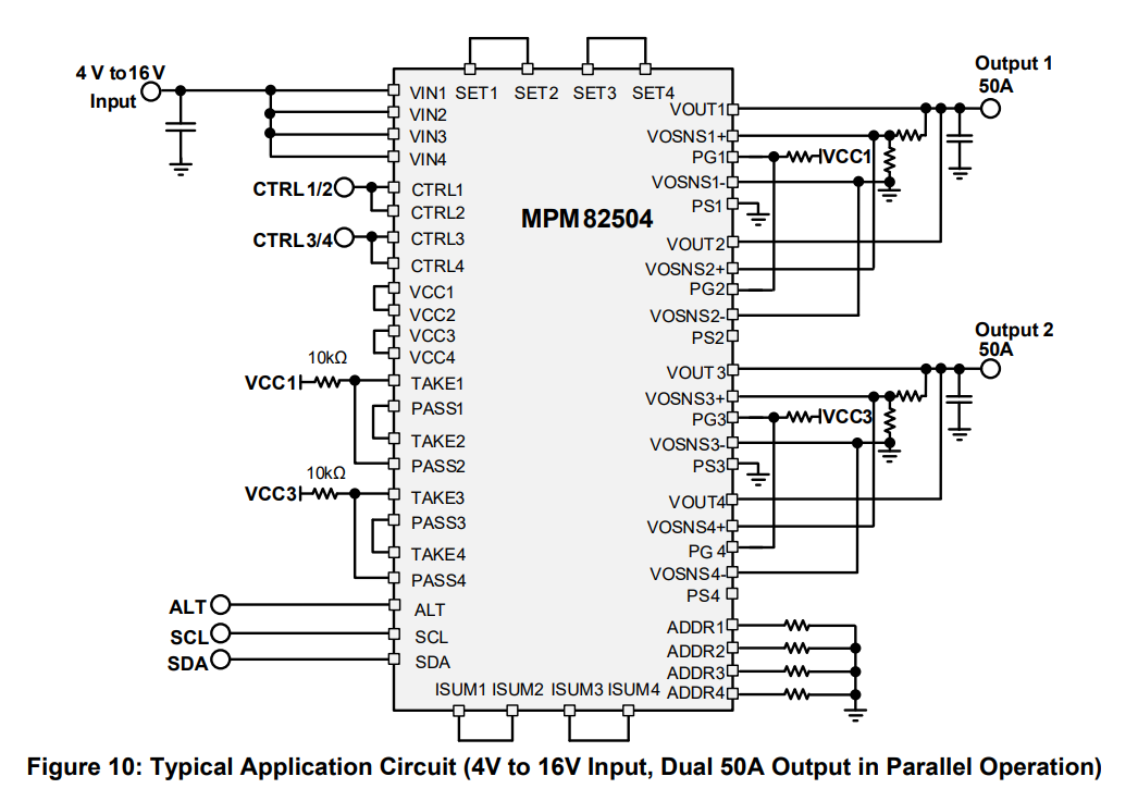Q-2: Can we directly use Part# MPM82504GBH-0001 in Place-1 to get at least 0.75V @ 50A (Ch-1 and Ch-2 Parallel output)? We have a provision to isolate the Ch-3 and Ch-4 parallel output from Ch-1 and Ch-2. So, Ch-3 and Ch-4 parallel output will be floating and unused. Will this work? Apart from this do we need to change any other connections?