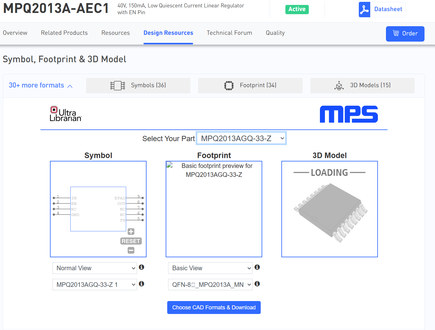 Here is a direct link for convenience: MPQ2013A-AEC1 | 40V, 150mA, Low Quiescent Current Linear Regulator with EN Pin | MPS