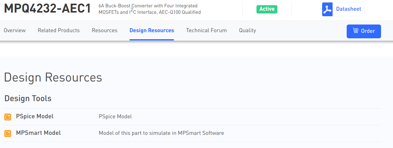 However, on the MPQ4232 website page, we have a PSpice and MPSmart model under the Design Resources tab: