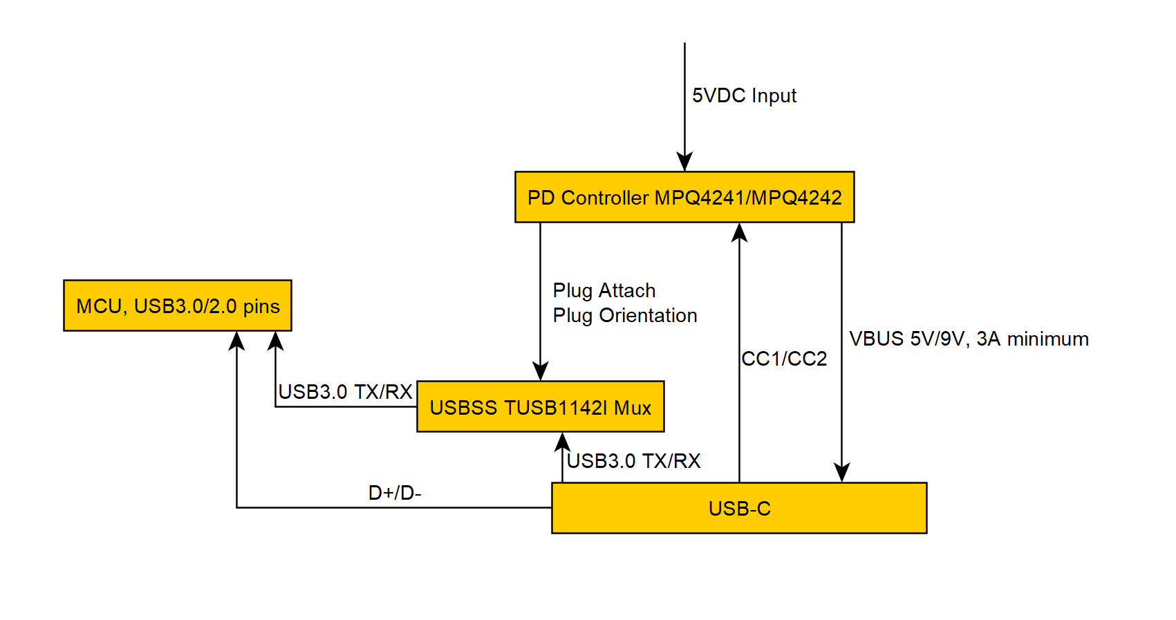 I plan to use the MPQ4241 with a USB-C in source-only mode. From what I understand, I need a USB SuperSpeed Mux (presently I have the TUSB1142I in my design) and I suppose I could then connect the D+/D- lines directly to the MCU (an STM32F7 processor). I’m wondering if the MPQ4242 is the right move here. I am unclear from the datasheets if you lose functionality when you hook up 5V to VIN on both of these for 27W PD.