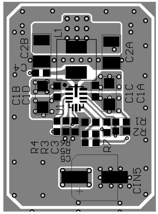 For both layouts, I will make my comments with respect to the top power plane as shown in the PCB Layout Guidelines. Here is a zoomed in image of this: