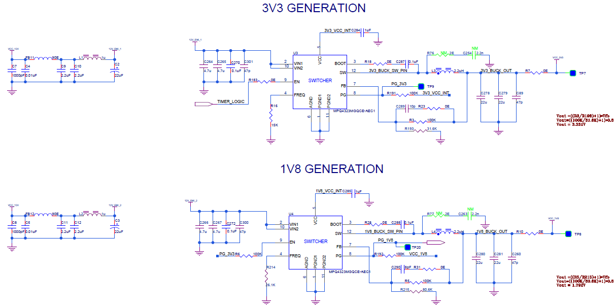 The DUT uses MPQ4323MGQCE-AEC1-Z buck converters for 3.3 V and 1.8 V generation. The overall power architecture is based on MPS buck converters and LDOs.