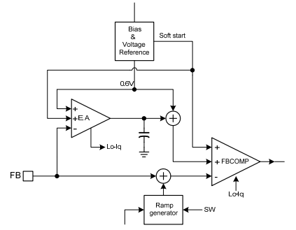 During this mode, only the error amplifier and the PWM comparator are active in the following architecture from the FB pin: