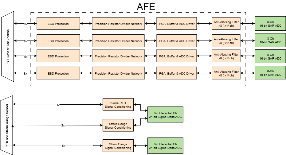 We are planning to use a single-ended ADC for the PZT sensor and a differential input ADC for the RTD & Strain gauge sensor. Attached is the block diagram of the sensor and ADC interfacing (without isolator).