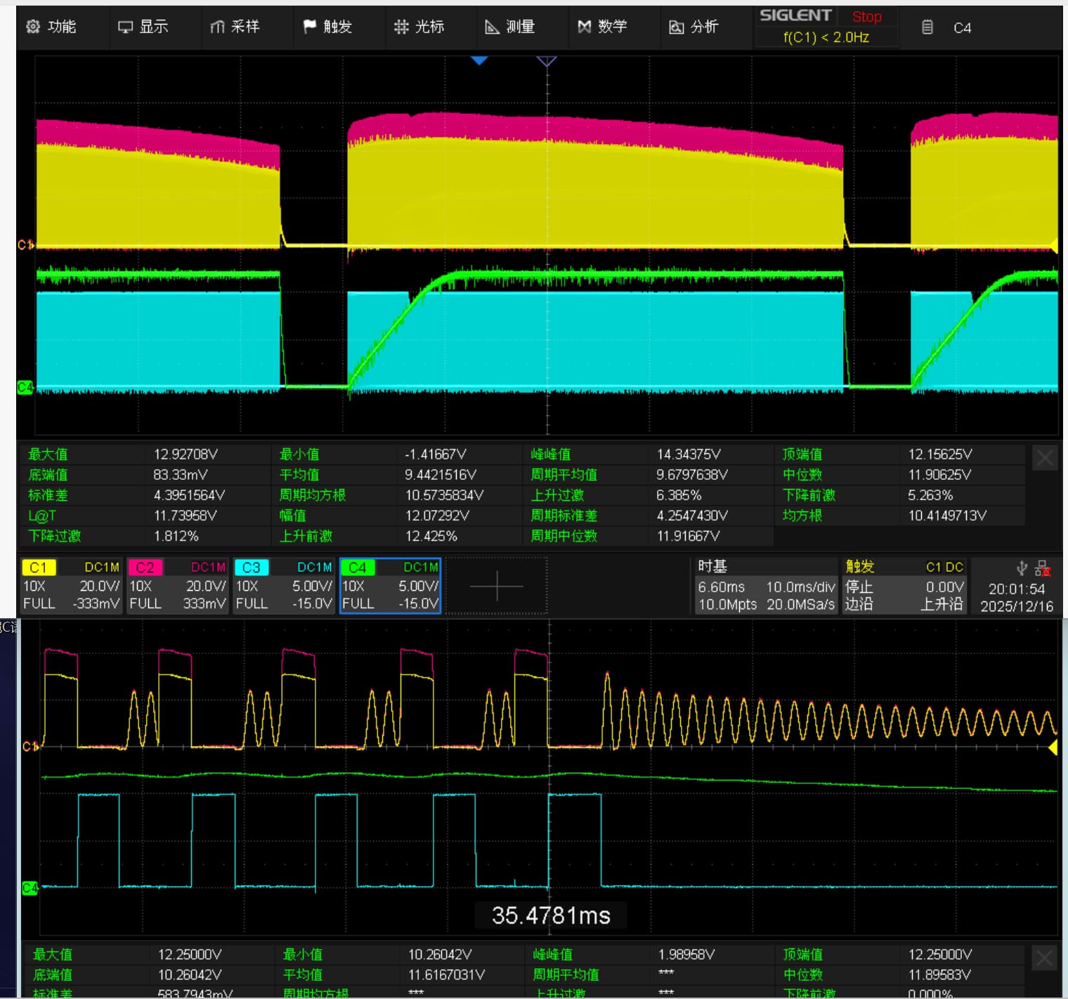 We found that when the output voltage suddenly drops to 0, the conduction time of the last gate signal BG of the lower tube will be longer than that of the BG signal when it is stable; When the output voltage remains stable at 12V, the amplitude of the signals from SW and TG will slowly decrease. I don’t know if it’s related to this.