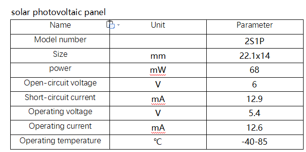 First, the solar panel has an open-circuit voltage of 6V and a short-circuit current of 12.9mA. For detailed parameters, please refer to the attachment.
