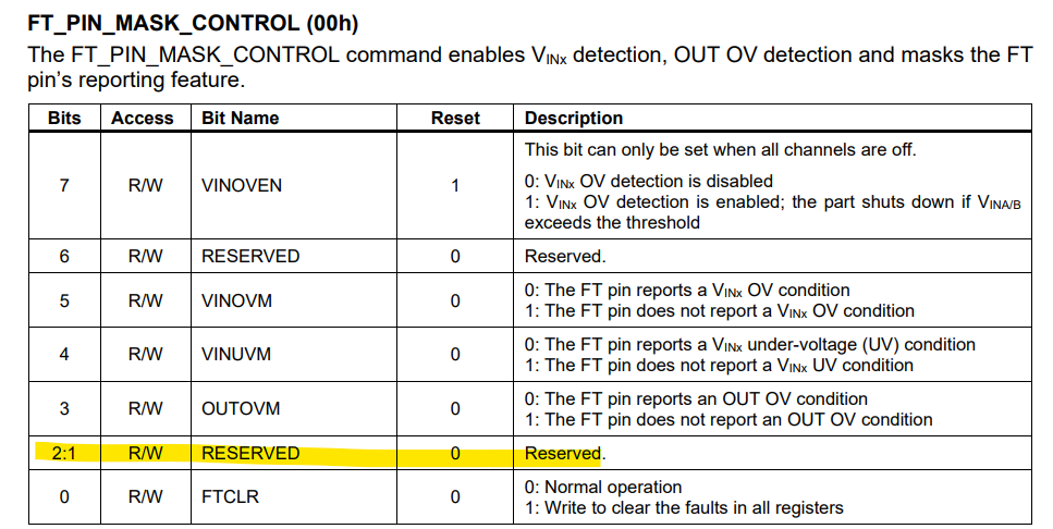 - But when 0x00 is written with value 0x83 - we are seeing that FT pin is HIGH and register 0x05 has value 0x00 (VINa/VINB UV fault is NOT present)